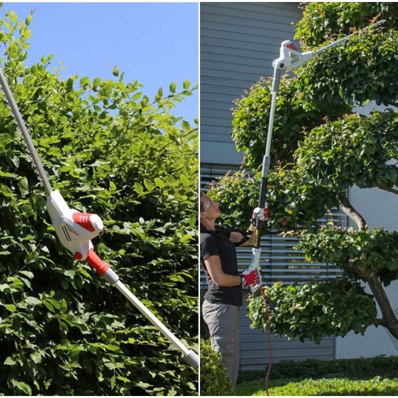 Dual action, laser cut and diamond ground blades with an aluminium guide rail, also a blade end protector makes your blades safe. Fibreglass and aluminium telescopic shaft is for variable height adjustment. This tool allows a working height up to 4m.
